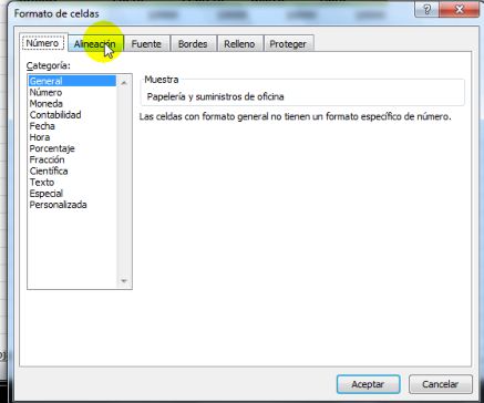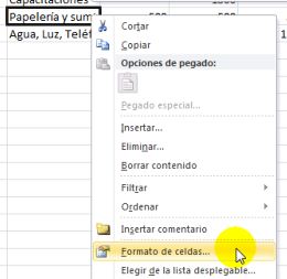 Nos posicionamos en la celda de Papelería y suministros de oficina, pulsamos el botón derecho del ratón y luego seleccionamos Formato de celdas...
