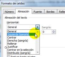 Eligiremos para este caso Alineación. La primera parte corresponde a la Alineación que ya vimos en lecciones anteriores. Esta vez elegiremos la combinación para los ejes Horizontal y Vertical, desplegando en el primero General o Izquierda