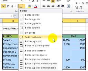 En las opciones que se desplegan seleccionamos Todos los bordes, esto dibujará los bordes atodas las celdas y en caso de querer imprimir en otro momento la tabla se verá correctamente
