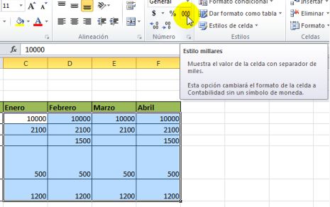 Seleccionamos y pulsamos de la barra de herramientas del botón Inicio, la opción para dar el estilo de miles o millares.