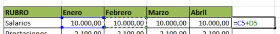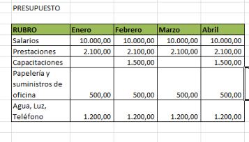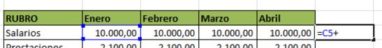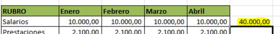 Tomemos el presupuesto preparado en lecciones anteriores. Si por ejemplo quisieramos sumar lo presupuestado en los cuatro meses para el Rubro Salarios, hariamos lo siguiente: