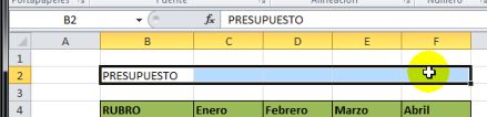 Sombreamos la celda donde se encuentra la pálabra Presupuesto y las demás celdas a continuación, en este caso desde la celda B2 hasta la celda F2. Que son las celdas que queremos combinar para centrar la información.