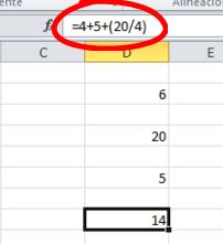 En casos en que quisiesemos hacer operaciones combinadas, las leyes de cálculo deberán cumplirse siempre en Excel. Por ejemplo si se desea realizar la siguiente operación: sumar cuatro más cinco y sumarle el resultado de dividir veinte entre cuatro. Es decir, 4+5+ el resultado de dividir 20 entre 4.