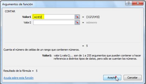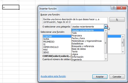 En el cuadro Seleccionar una función encontraremos las más usadas. Seleccionamos la función Contar.