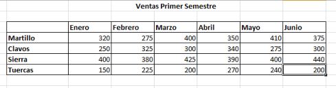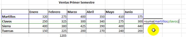 También podremos Sumar o realizar otras funciones combinando Rangos. En este caso tomaremos las Ventas Totales Semestrales de Martillos y Clavos