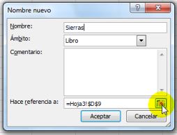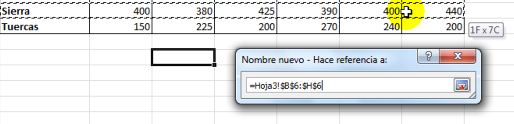 Asignamos un Nombre en el campo correspondiente, en este caso será para el rubro Sierras. Seleccionamos el conjunto de datos que forman parte del rango, esto lo realizamos sombreando en la hoja de trabajo las celdas correspondientes
