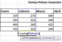 Escribimos en la celda el signo igual (=) para dar inicio a la operación, seguidamente de lapálabra Suma y el nombre del rango Febrero entre paréntesis.