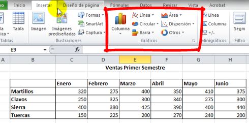 La opción de Gráficos se encuentra en la pestaña correspondiente a Insertar, de la barra de herramientas
