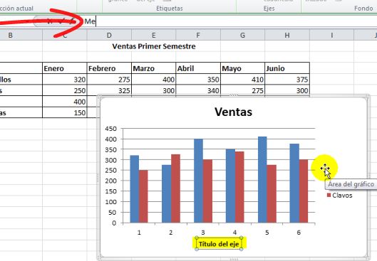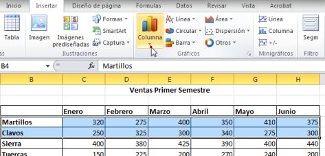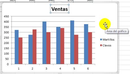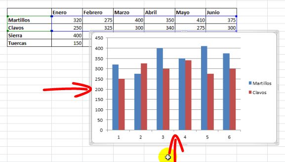 Hemos creado en la lección anterior un gráfico de columnas de la información de las ventas de martillos y clavos en los meses de enero a abril.