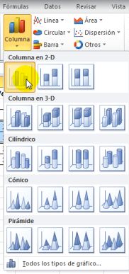 Seleccionamos el tipo de gráfico que deseamos, en el ejemplo escogeremos Columna. Pulsamos y se abrirán las opciones correspondiente al tipo de gráfico Columna. Seleccionamos alguno apropiado.