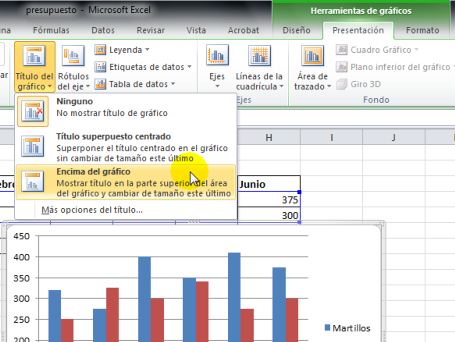 Para colocar un titulo por ejemplo, Buscamos en la barra de herramientas de gráficos, la sección correspondiente a Etiquetas. Seleccionamos y pulsamos Título de gráfico y al desplegar el menú elegimos Encima del gráfico.