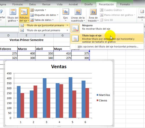 Nos posicionamos sobre el gráfico y dentro de la Pestaña Presentación seleccionamos Rótulos del eje,2) Se desplegarán las opciones. Primero seleccionamos Título del eje horizontal primario y allí nos aparecerá Título bajo el eje.