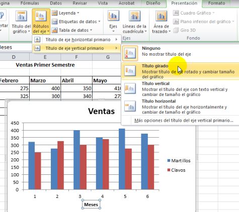 Luego pulsamos nuevamente Rótulos del eje y seleccionamos Título de eje vertícal primario